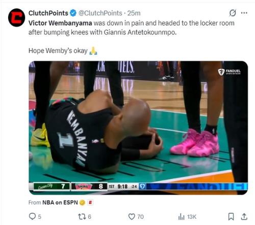 开场2分钟光头文班亚马就在一起防守中跟扬尼斯的膝盖发生碰撞,文班亚马倒地不起,随后文班亚马下场检查。字母哥毫发无损单节6分37秒,5中4+三分1中1+罚球6中5拿到14分2篮板1助攻2抢断,字母哥在场时还领先1分。